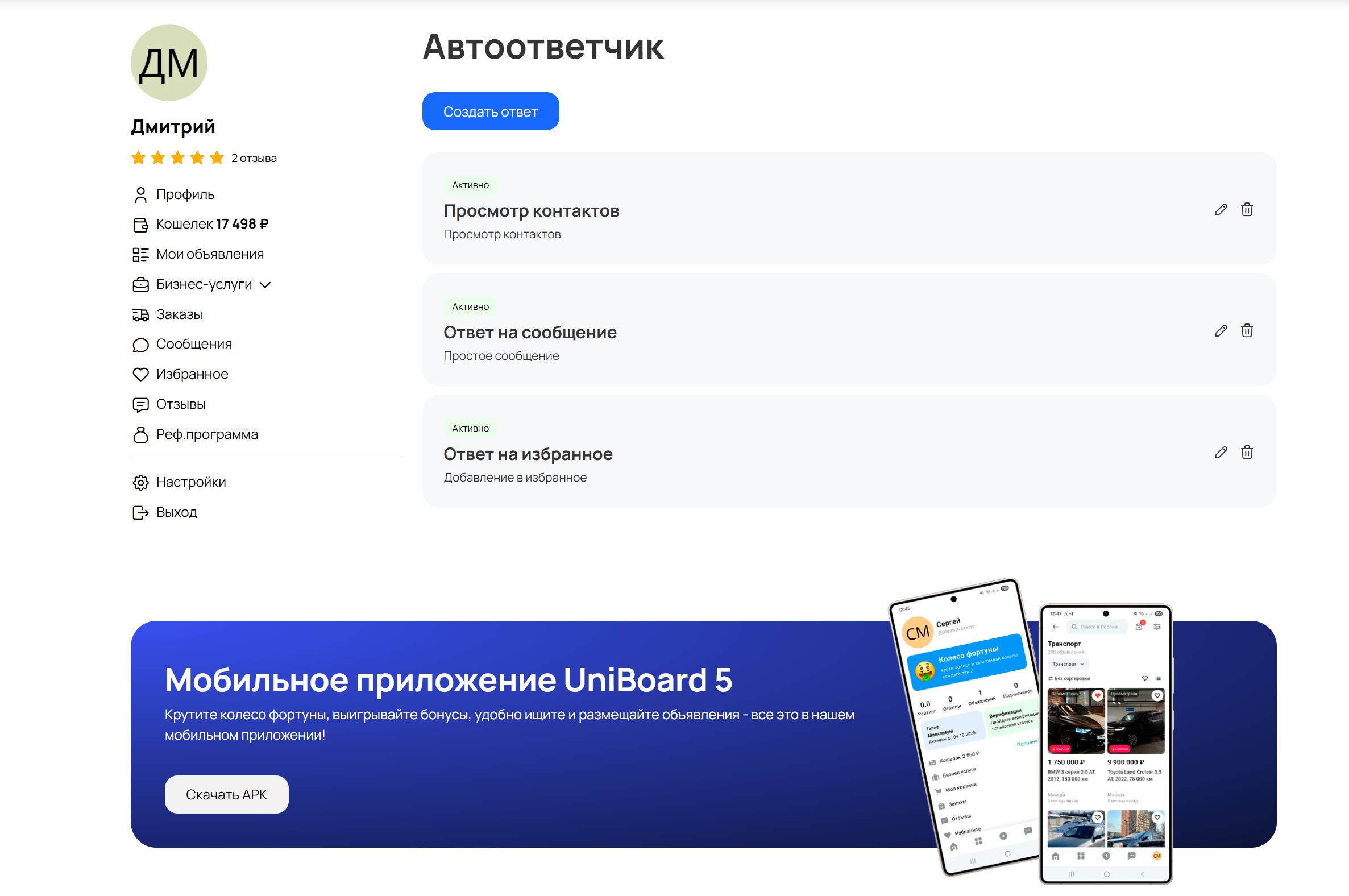 Модуль «Автоответчик» для бизнес‑услуг профиля